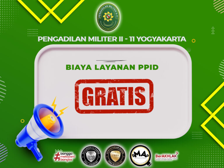 Selamat datang di situs resmi Pengadilan Militer II-11 Yogyakarta dengan moto "ISTIMEWA" (Integritas, Solid, Tangguh, Imparsial, Militan, Empati, Wibawa, Amanah) -  sesuai SK Gubernur DI Yogyakarta No.166/KEP/2017 tentang Penamaan Jalan Arteri (Ring Road) Yogyakarta, alamat Pengadilan Militer II-11 Yogyakarta yaitu Jalan Majapahit -