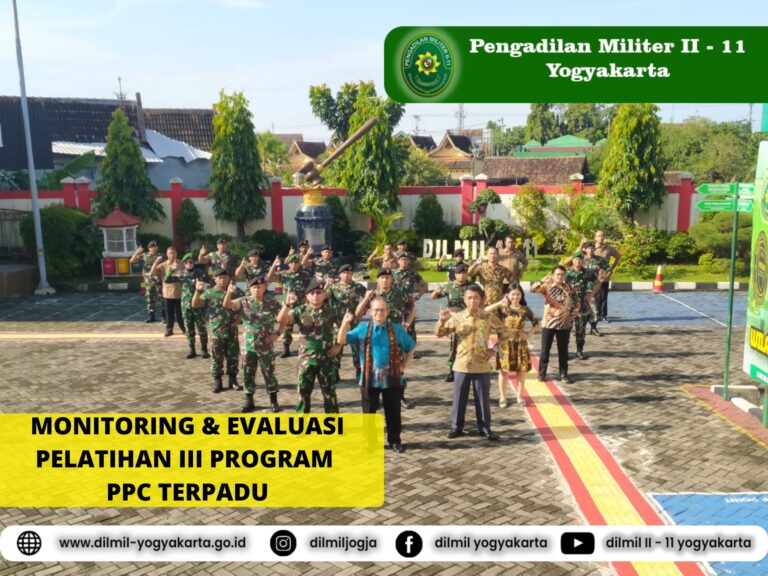 Yogyakarta, Pengadilan Militer II-11 Yogyakarta kedatangan Tim Monitoring dan Evaluasi Pelatihan III Program PPC Terpadu yang terdiri dari Bapak Ennid Hasanuddin, S.H., C.N., M.H., Kolonel Chk Sutrisno Setyo Utomo, S.H., M.H. beserta anggota Tim.