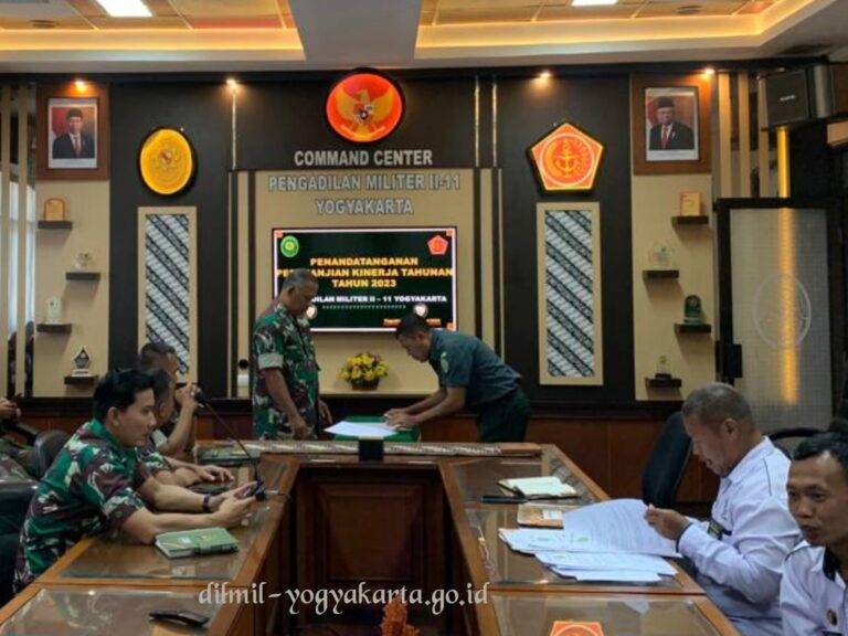 Acara Penandatanganan Pakta Integritas dan Perjanjian Kinerja Tahun Anggaran 2023 di pimpin oleh Kepala Pengadilan Militer II-11 Yogyakarta Letnan Kolonel Chk Rony Suryandoko, S.I.P., S.H., M.Han. yang diikuti oleh seluruh Hakim, para pejabat struktural dan seluruh personel Pengadilan Militer II-11 Yogyakarta.