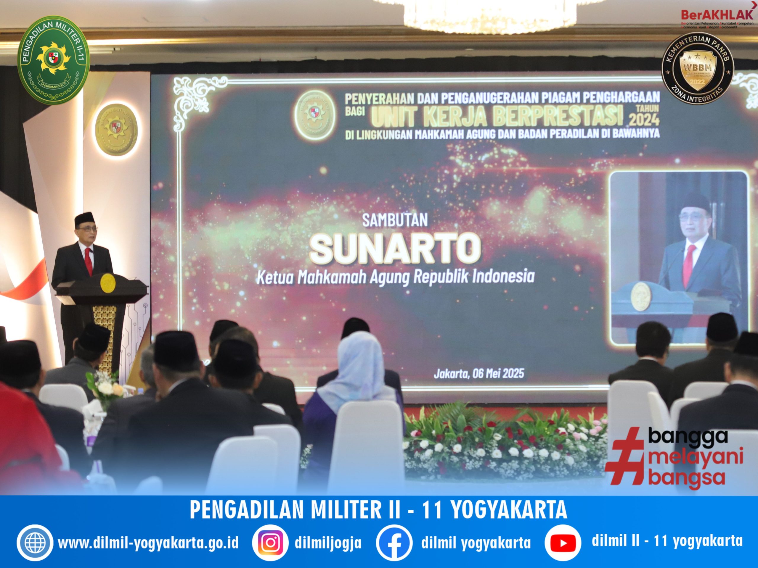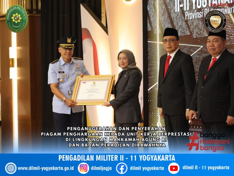 Kepala Pengadilan Militer II-11 Yogyakarta Letnan Kolonel Kum Jonarku, S.H., M.H. menghadiri acara penganugerahan dan penyerahan Piagam Penghargaan unit kerja berprestasi di lingkungan Mahkamah Agung RI dan Badan Peradilan di bawahnya.